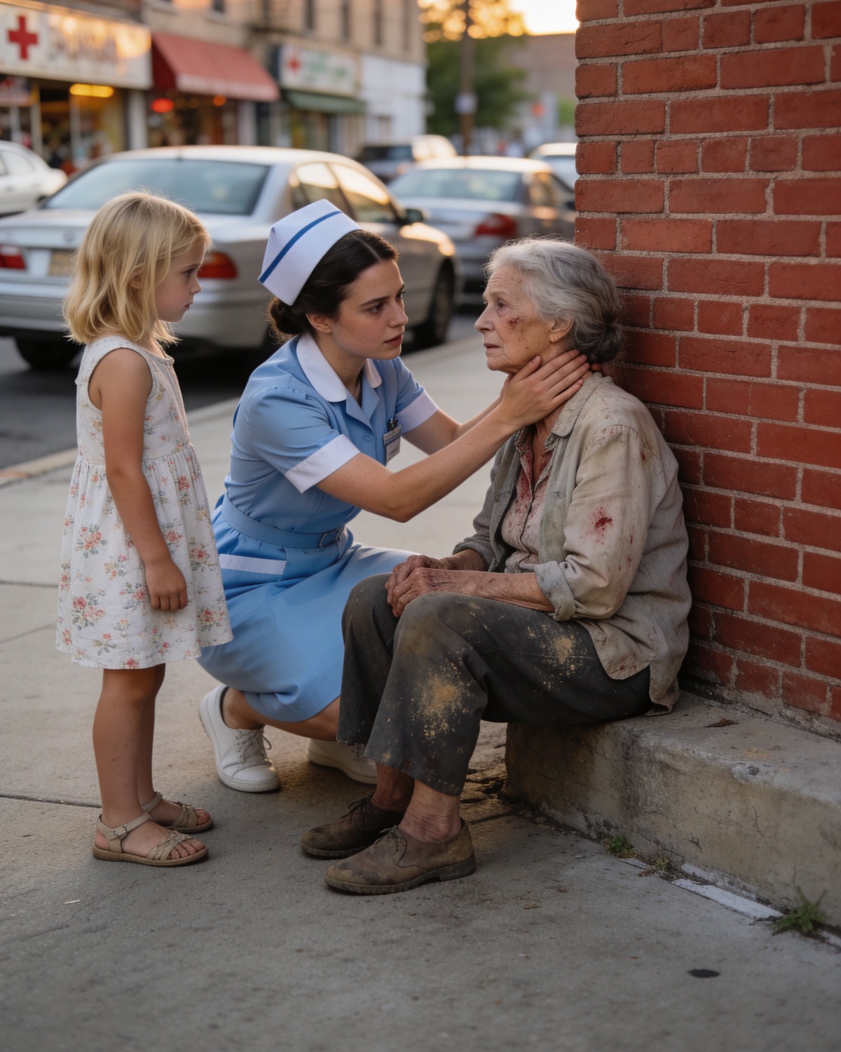 A young nurse in a blue uniform was kneeling beside her, moving with the precision of someone trained for emergencies.