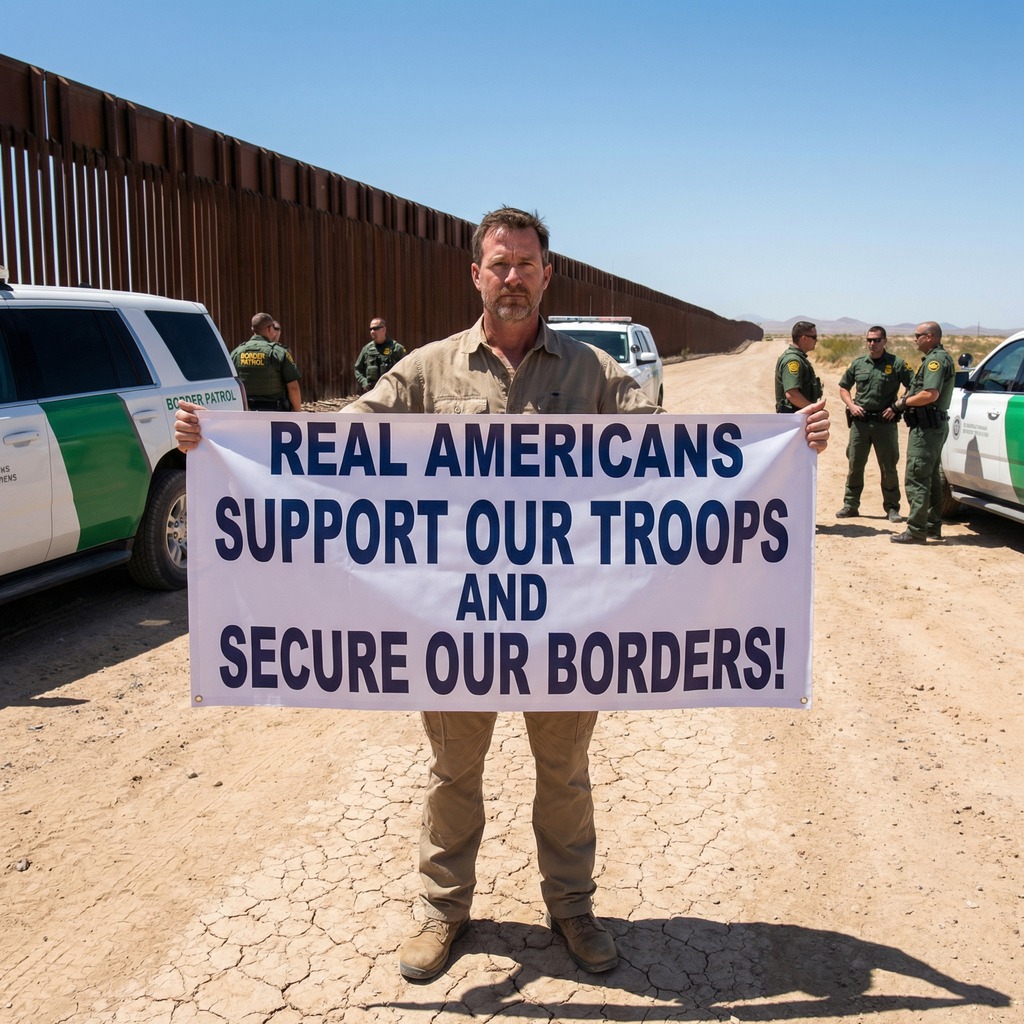 Inside the image is a familiar American scene: a man holding a banner that reads like a vow, border enforcement vehicles behind him, uniformed personnel nearby, and a message aimed straight at the country’s nervous center—security, sovereignty, and support for those asked to stand watch.