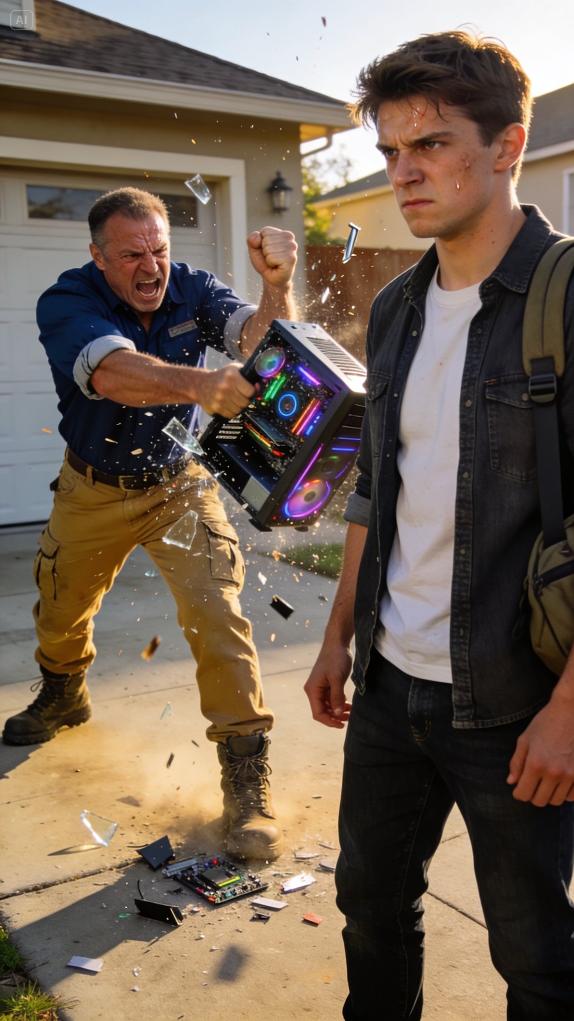 The tower hit the driveway with a sound like a dropped engine block—plastic cracking, metal groaning, glass tinkling into the gutter. Ethan Parker froze in the doorway, one hand still on his bedroom knob, watching his gaming PC lie on its side like a wounded animal.