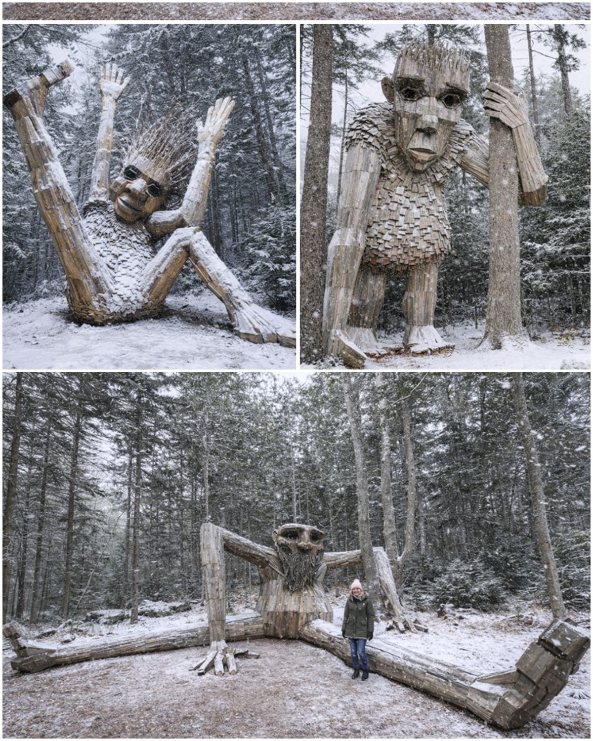 Dambo’s trolls, made from natural materials like wood, branches, and twigs, are a testament to his commitment to sustainability. Each troll is constructed with materials sourced from the surrounding area, giving them an organic, earthy presence that feels as though they’ve grown out of the land itself. The trolls, with their intricate details and striking sizes, evoke a sense of timelessness—like ancient guardians who have been watching over the earth for centuries.