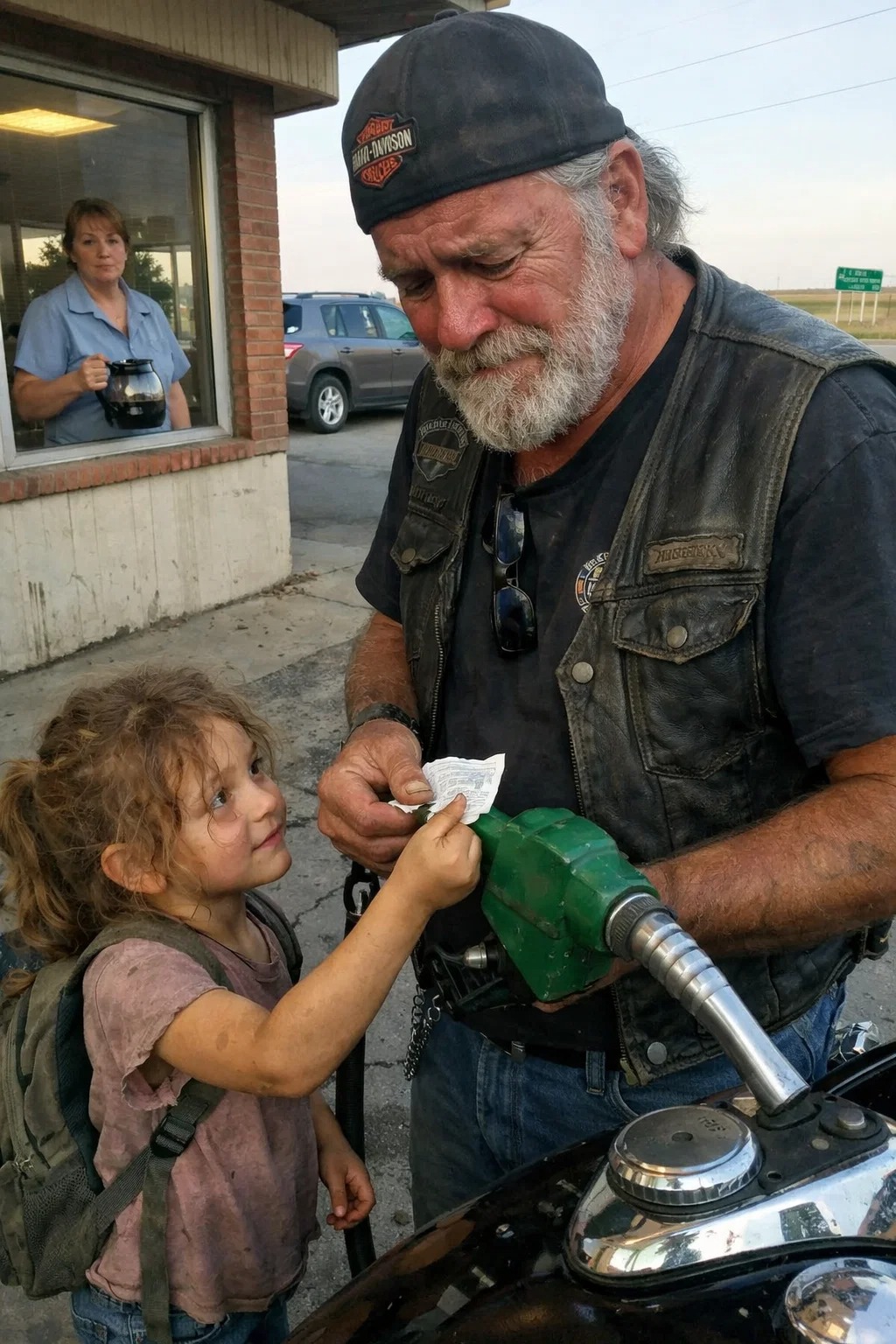 His name was Thomas “Tom” Grady, sixty-four years old, a former mechanic whose broad shoulders had slowly bent under the quiet weight of loss rather than age. Every Wednesday morning, without fail, Tom’s deep green Harley rolled off the highway and into the gas station lot just after sunrise. The engine always settled into silence beside pump two, and Tom would remove his helmet slowly, as though stepping out of another version of his life before looking across the road with the patience of someone who had already waited longer than most people believed reasonable.