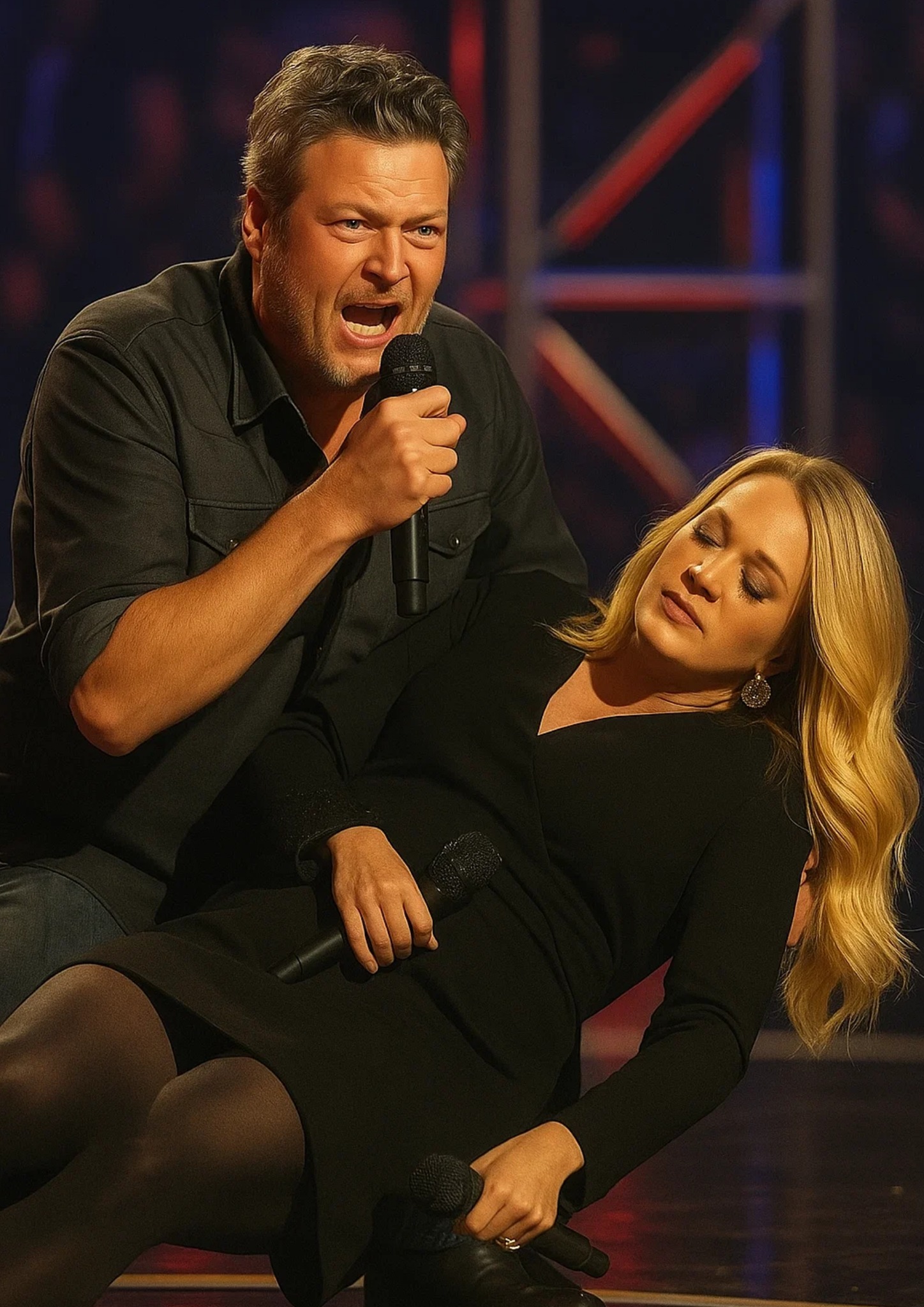 THE MOMENT THAT STOPPED NASHVILLE COLD According to multiple fictional eyewitness accounts, the terrifying incident struck during a high-stakes rehearsal of a mashup designed for the show’s grand finale. Carrie and Blake were working through harmonies, trading verses, laughing between takes — the kind of chemistry that producers dream about. Then, without warning, something shifted.