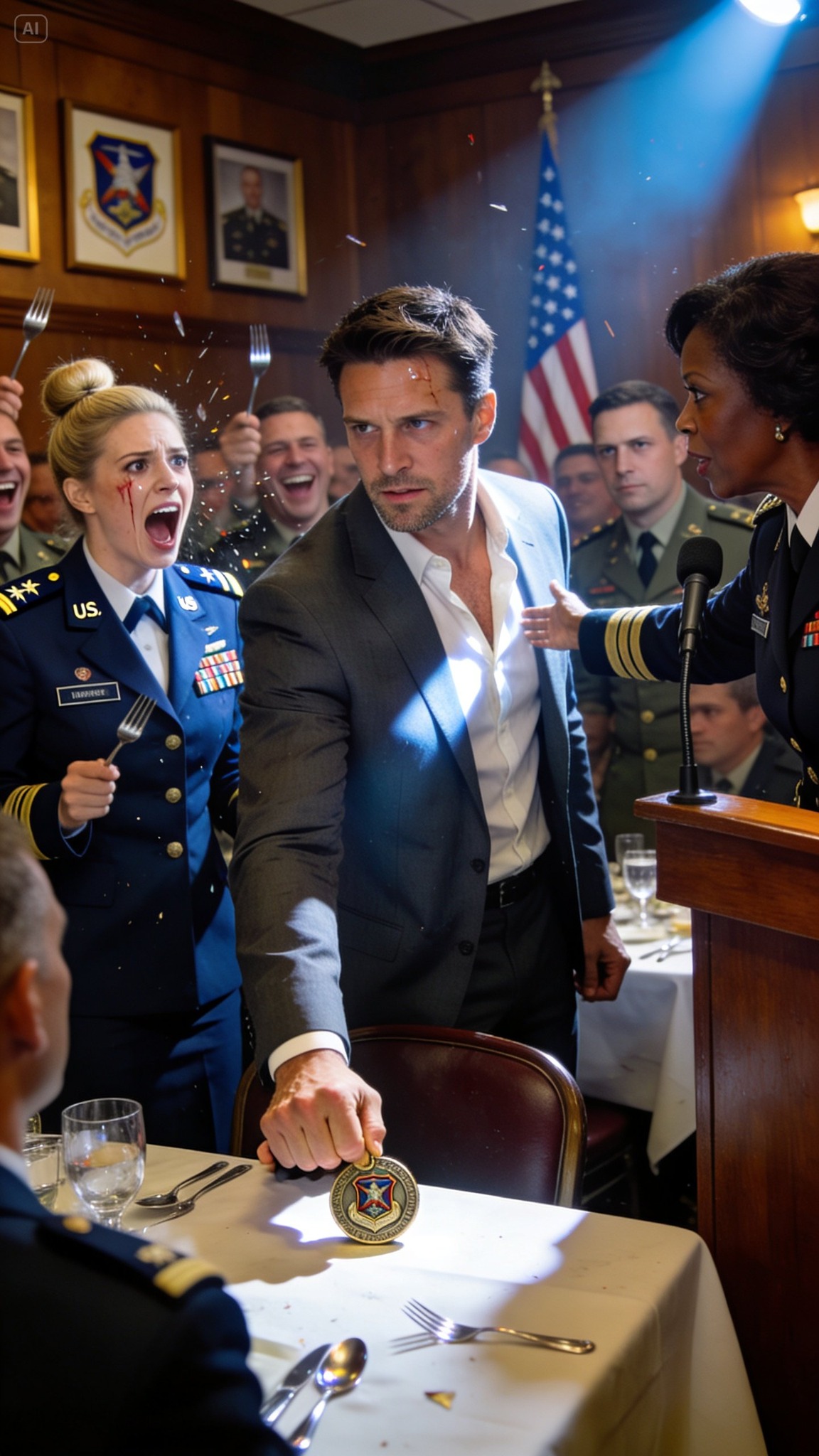 At that moment the music cut off. A microphone squealed. The room hushed as Colonel Denise Caldwell stepped to the podium. She raised a glass, eyes sweeping the tables.