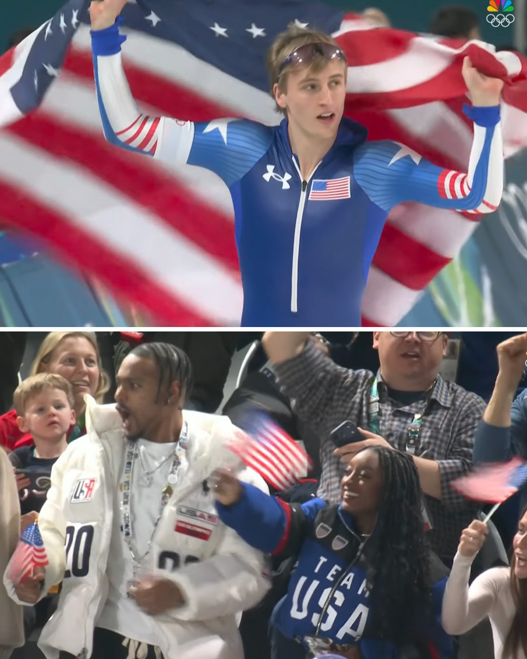 And in Milan, as Jordan Stolz exploded down the oval in a record-breaking 33.77 seconds to capture gold in the men’s 500m speed skating final, one of the loudest reactions didn’t come from the stands.