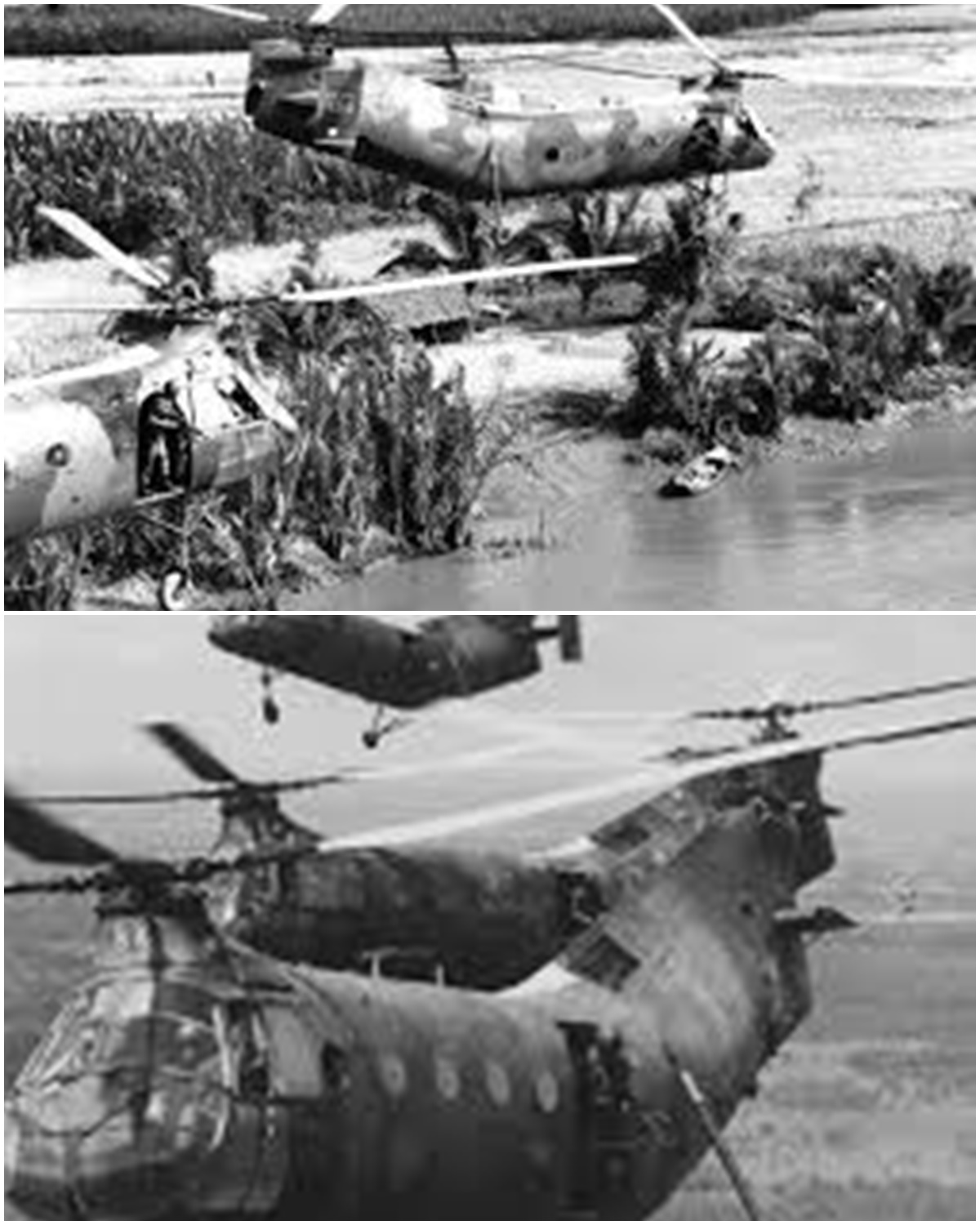 U.S. door gunners, stationed in H-21 Shawnee helicopters above the scene, immediately sprang into action. They scanned the banks of the Mekong River, looking for any sign of movement, as the sound of the helicopter’s rotors echoed through the misty morning air. The mission was clear: locate the enemy guerrilla and provide cover fire to support the South Vietnamese ground forces.
