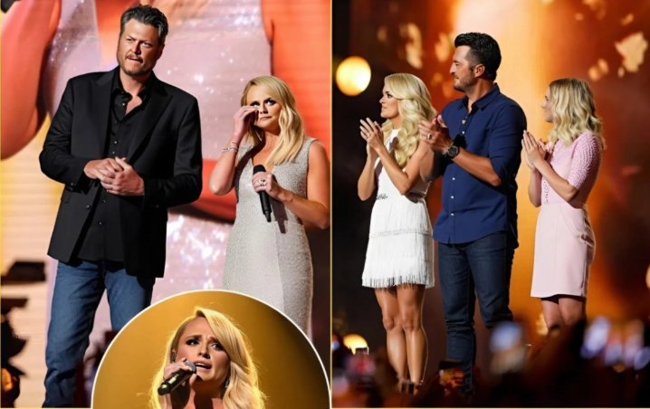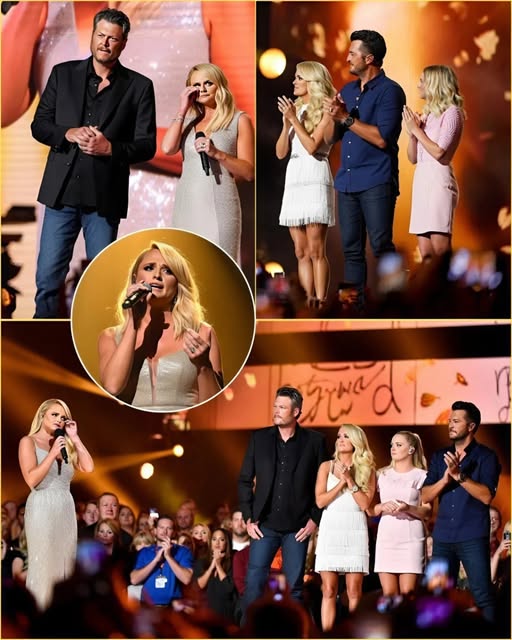 Instantly, thousands of fans gasped, phones lifted into the air. The camera operators knew exactly where to turn — toward the front row, where Blake Shelton sat among a lineup of country music’s finest: Carrie Underwood, Luke Bryan, Kelsea Ballerini, and Jelly Roll. For a split second, Blake didn’t move. His expression froze — not from shock, but from recognition. He knew what was coming.