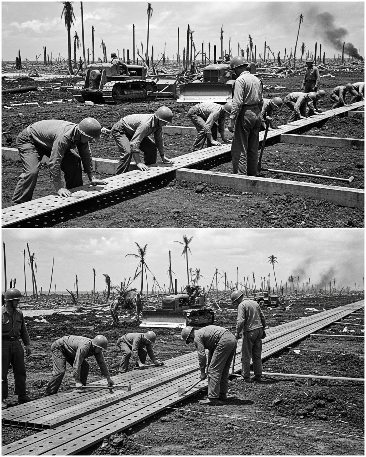 The islands seized by U.S. forces in 1944 were rarely hospitable. Many were little more than coral reefs, swamps, volcanic rock, or dense jungle. There were no roads. No infrastructure. No stable ground. What existed had usually been cratered by naval bombardment and aerial bombing.