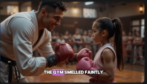 As the laughter and bravado echoed through the gym, a small figure stepped into the ring, her presence almost dwarfed by the size of the mat.