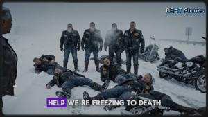 What she saw made her blood run cold: nine hulking figures clad in Hells Angels vests lay scattered along the roadside, their motorcycles abandoned in the snow.