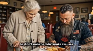 As she prepared to leave, the bearded biker stood up, extending his hand.