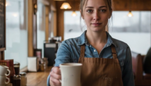 Jake approached the counter, where a young woman stood, her hands busy preparing coffee.