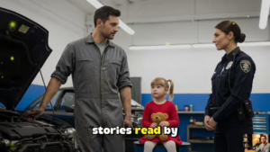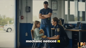 The shop was filled with tools and car parts, but what caught her attention was a little girl, perhaps six or seven, sitting on a stool, her feet swinging playfully.