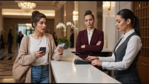 “Good evening, ma’am. How can I assist you?” the receptionist asked, her tone dripping with condescension.