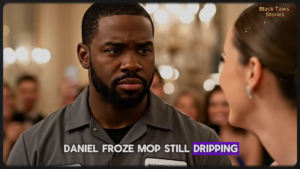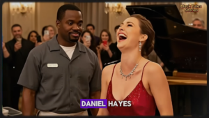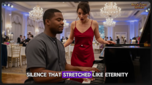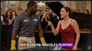 As she sipped her champagne, her eyes fell on a figure in the corner—a janitor named Marcus, clad in a worn uniform, diligently cleaning the grand piano that dominated the room.