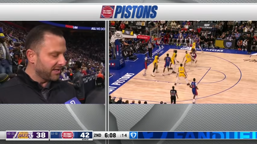 corner dish to Dane as Jenkins and he delivers from >> as they’re broadcasting George he said he’s very impressed with the Pistons why because they play so hard you just saw in against Luca tapped away by Luca Dar LeBron down the lane lays it up lays it in >> you know maybe he’s not going to look to score so much sometimes those shots aren’t there the ones he wants meantime >> Labraia’s getting Ron Holland took it right to the rim for a score.