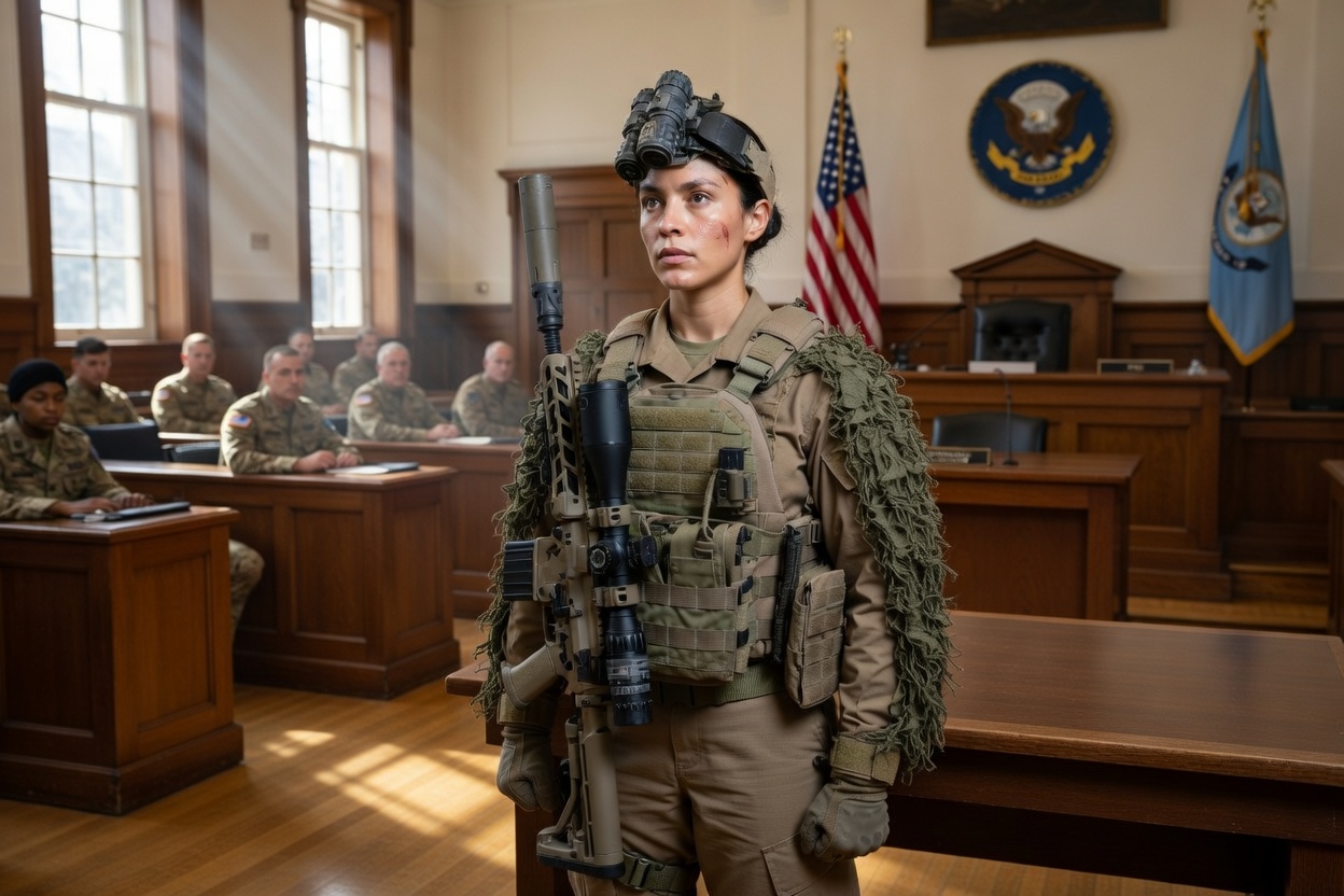In a crowded military courtroom, cameras flashed as she sat in handcuffs.
